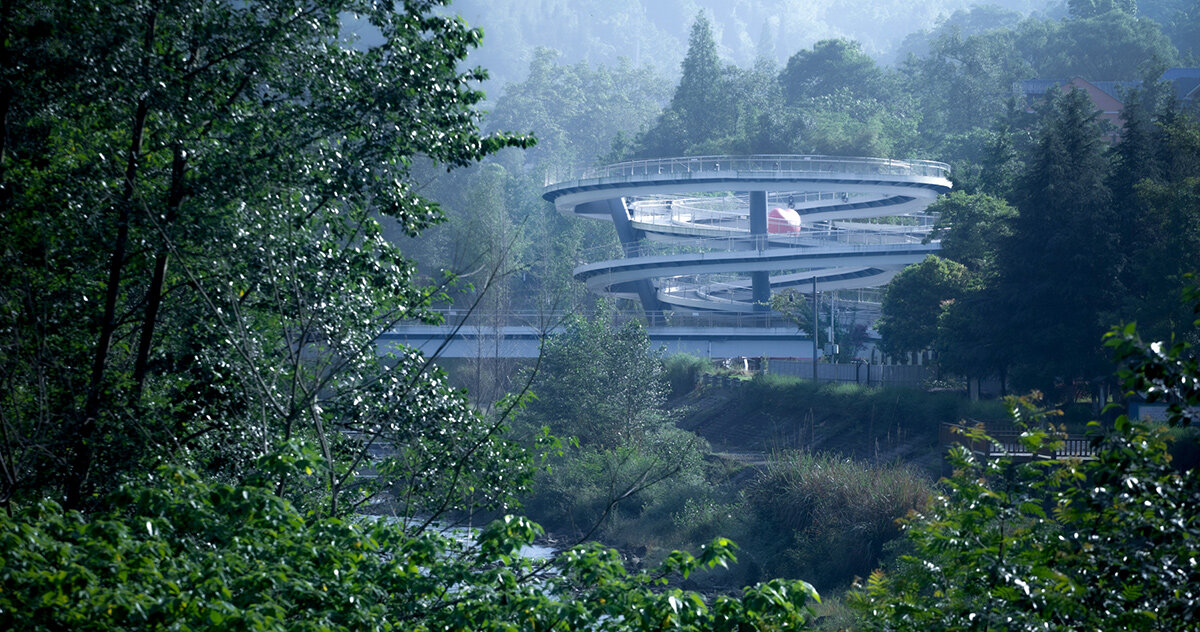 este equipo El puente en clave de sol esculpido por ZZHK Architects recuerda el carácter cíclico de la clave de sol. Una rampa en espiral se eleva desde la orilla del río y conduce al escenario al aire libre de Music Town, mientras que un segundo circuito lleva a los visitantes a una plataforma de observación elevada.