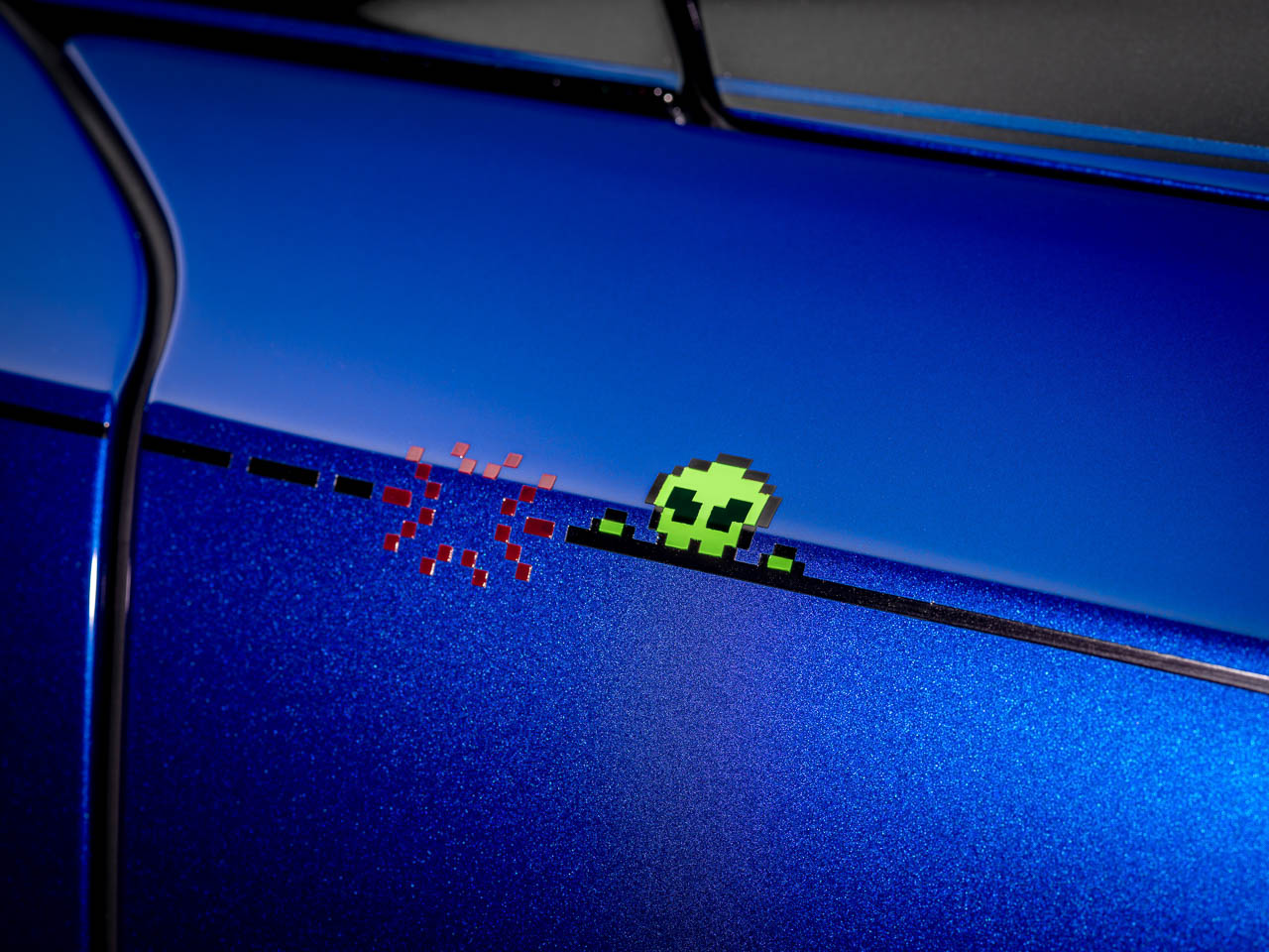 Salamanca Blue cubre la parte inferior del cuerpo, mientras que Crystal Diamond Black cubre la parte superior del cuerpo. Las líneas del cuerpo presentan un patrón de «alienígena descarado» dibujado a mano, cada uno de los cuales consta de 89 píxeles individuales que miden un octavo de pulgada cuadrada. Un lado muestra un extraterrestre verde con una explosión rosa de 8 bits y el otro lado muestra variaciones de amarillo y azul. Cada píxel requería una colocación precisa y una aplicación constante de pintura para mantener una estética digital a escala de automóvil.