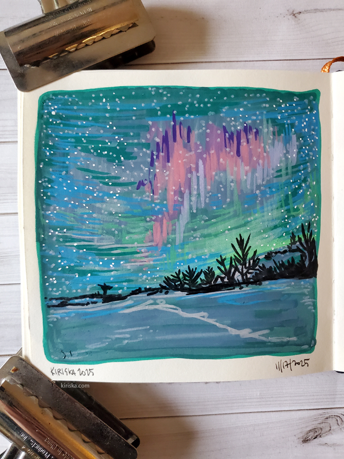 Dado que la pintura dispensada por el rotulador está fija encima Papel en lugar de tinta absorbida. Ingresar papel, ¿me imagino usándolos en la parte superior de la página donde la marca de alcohol se ha filtrado en la parte posterior? ? ? Investigaré… si tengo éxito, nunca terminaré este cuaderno de bocetos.