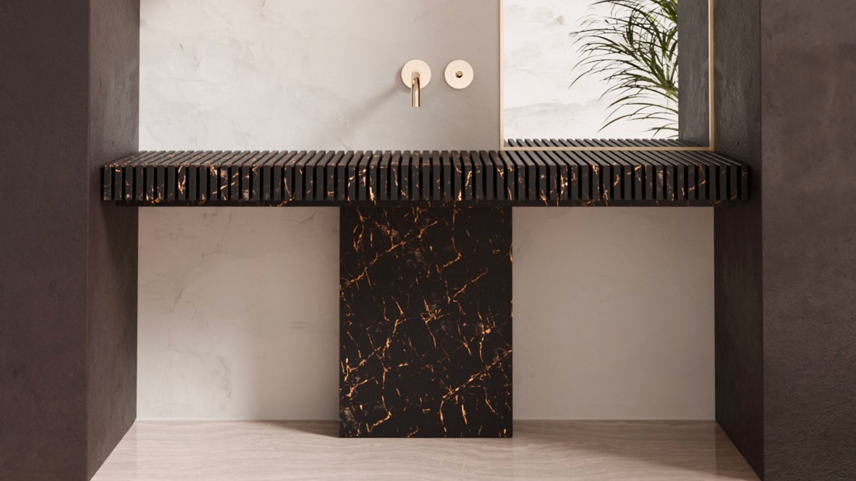 La marca italiana Serafini ha creado un modelo personalizado. lavabo El concepto de interiores de alta gama consiste en una hilera rítmica de mármol Paneles que ocultan hábilmente el sistema de drenaje.