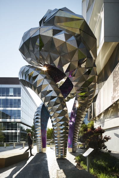Orbital está ubicado a 34 pies sobre la plaza en la antigua sede de Uber en Mission Bay. FUTUREFORMS diseñó Orbital como un jardín contemporáneo, creando un vínculo entre la artesanía digital y la presencia orgánica.