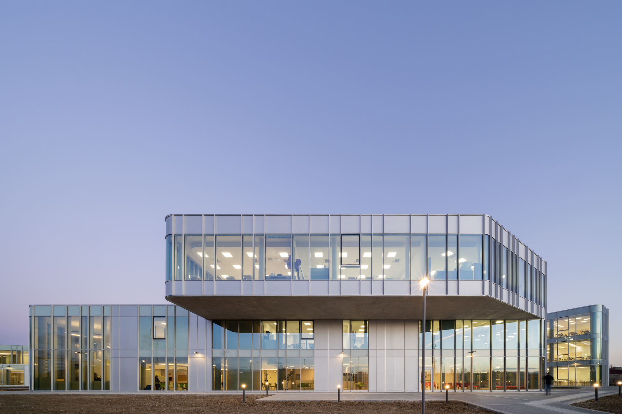 Se eligieron diferentes personajes para los diferentes frentes debido a los artefactos circundantes. En el lado oeste, se presenta una fachada continua con una mayor proporción de superficie acristalada respecto a las partes opacas, sirviendo como señal de apertura y bienvenida a los usuarios y a la comunidad; La configuración propuesta se relaciona con carriles bici, tráfico y movilidad peatonal, y espacios verdes cercanos. Los laboratorios rigurosos y funcionales están orientados hacia el este, lo que exige una inversión de la relación transparente/opaca.