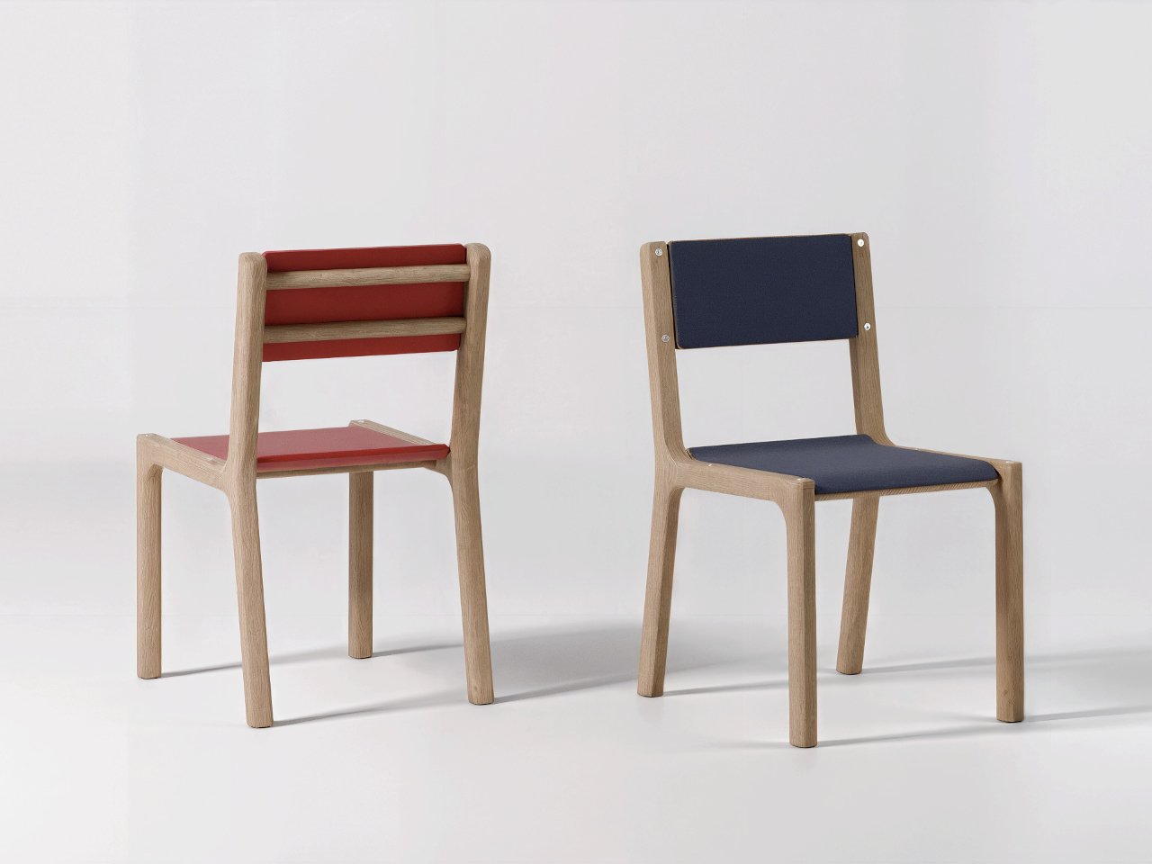 La estructura básica es simple. Los marcos de madera curvados o laminados forman los soportes para las piernas y el respaldo, mientras que las vigas horizontales soportan cargas estructurales. El asiento y el respaldo son paneles separados, cada uno asegurado con cuatro tornillos y visibles desde la superficie. Estos tornillos muerden las inserciones roscadas de metal incrustadas en la madera, por lo que los paneles se pueden quitar y volver a instalar repetidamente sin dañar el material ni pelar las roscas.