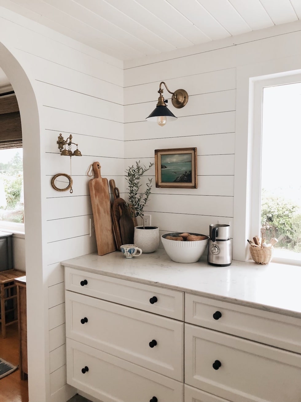 Este es mi gabinete de café, aquí es donde guardo nuestras cosas. (¡Asequible!) Máquina de café expreso Y muchos de nuestros útiles y vasos. esto es un Publicado en el papel tapiz despegable que utilicé aquí y ¡mira dónde colocamos el filtro de agua! El agua filtrada es fundamental para saborear el mejor café (en mi opinión).