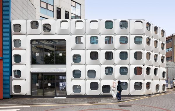 La clínica se presenta en la calle como un edificio redondo, blanco y de líneas limpias que rompe con los edificios del entorno y se acerca a las construcciones sencillas de paredes encaladas típicas de esta zona de Huelva. La puerta de acceso es también un componente clave, diseñada para ser acogedora cuando está abierta y completamente integrada en el edificio cuando está cerrada.