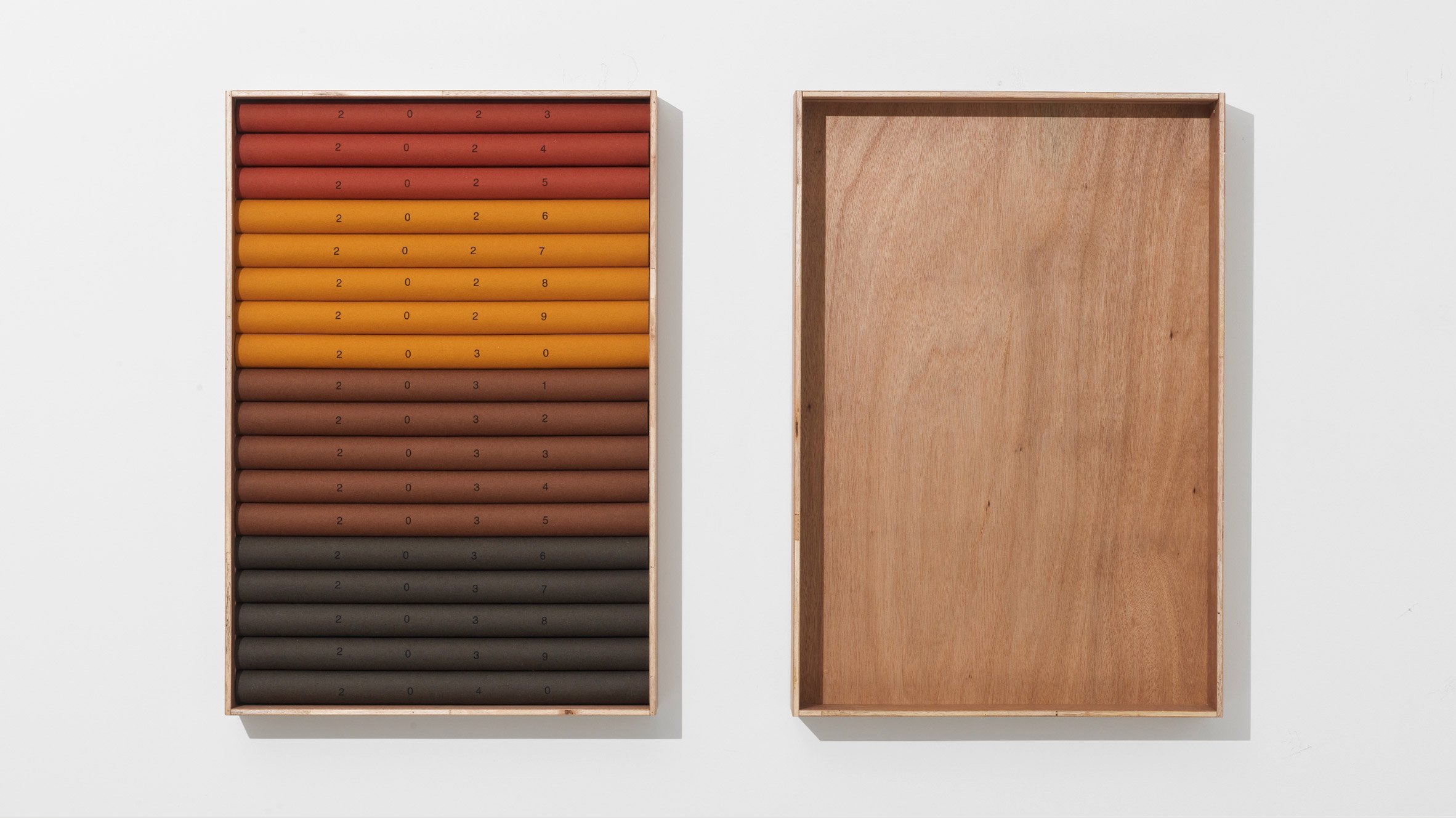 Cada año, se mueve un rollo y se cuelga en el marco adecuado. El calendario se acumula lentamente y los objetivos de la hoja de ruta neta cero de Kvadrat aparecen gradualmente en la superficie de madera detrás del calendario en la imagen de la izquierda.