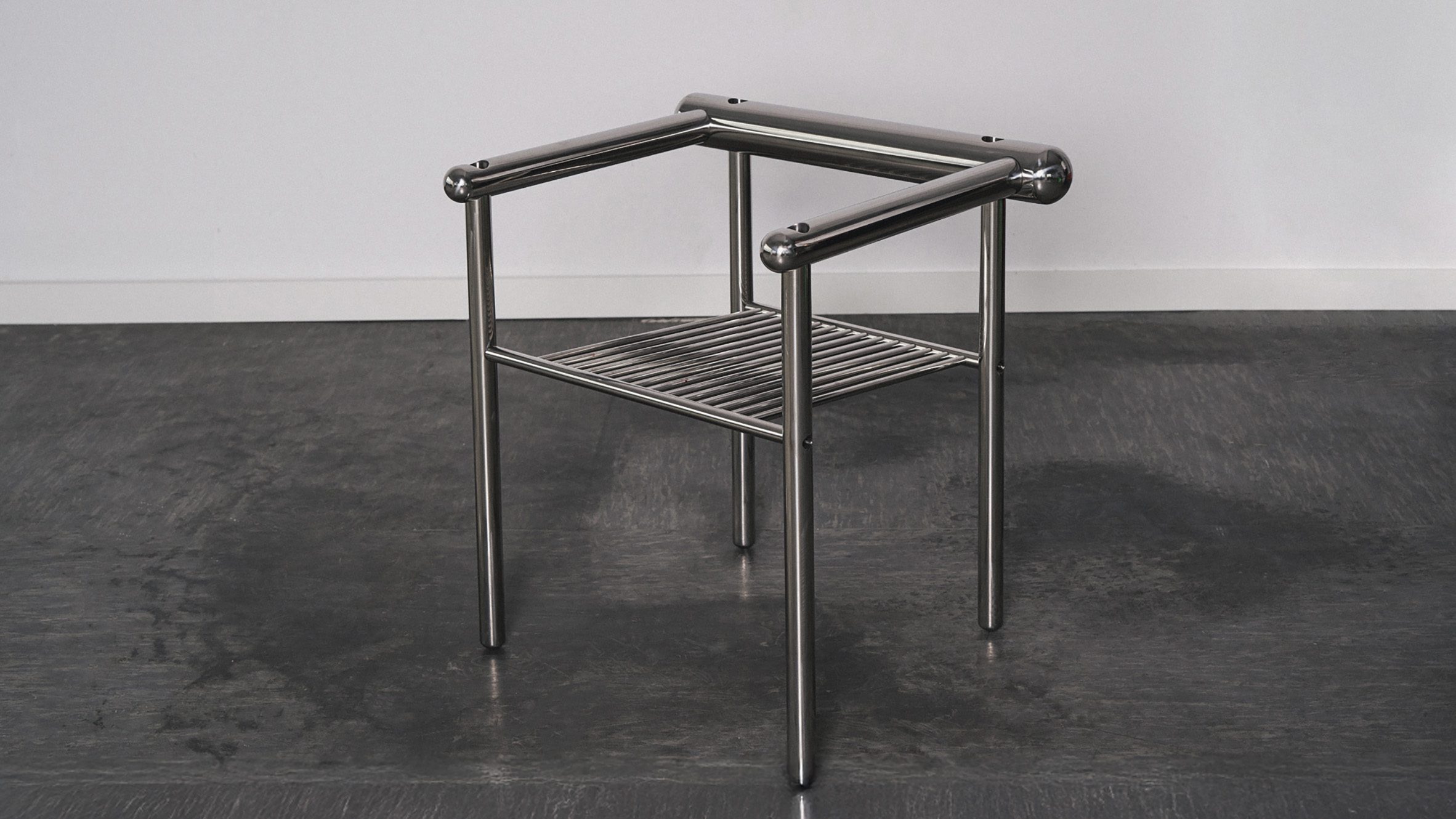 Sala de exposición Dezeen: el acento de esta frase Silla Diseñado por diseñadores polacos. escipiola muerta Hay un pulido aceroel marco de borde redondeado le da una estética futurista.