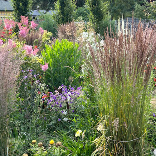 Jardín de pradera con plantas con flores y plantas de follaje coloridoLas plantas perennes son más visibles a principios del verano, pero a medida que avanza la temporada, los pastos comienzan a aparecer.
