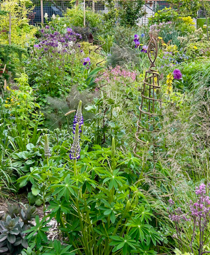 ¡Hola! Este es mi segundo verano en mi nuevo jardín en Port Townsend, WA. Hace poco más de un año, redujimos el tamaño de nuestro jardín de 1 acre en las afueras de Portland, Oregón, y nos mudamos al norte a un cuarto de acre de terreno urbano. La segunda mitad es mi paisaje. Toda la parcela está cubierta de cerezos silvestres, moras y rosas silvestres muertos. Los quitamos todos, labramos el suelo arenoso y agregamos varios camiones de abono. Dividí el jardín en tres partes, un huerto, un prado y un jardín de sombra. Traje muchas plantas de mi jardín anterior, por lo que el jardín quedó básicamente gratis para mí. La primera imagen muestra la sección de césped con pintura en aerosol aplicada a mi plano de cuadrícula. En el prado planté más plantas perennes informales y varios pastos del borde anterior.