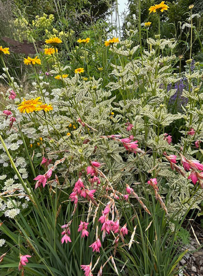 Plantas de follaje variado detrás de plantas con flores rosadasMe gusta especialmente esta combinación de girasoles artificiales ‘Loraine Sunshine’ (heliosis ‘Su Khan’regiones 3–9) y diorama “Joyas del mundo vegetal” (diorama «Joyas del mundo vegetal»zonas 7-10).