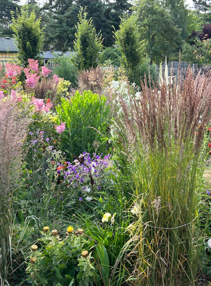 Hierba frente al jardín de pradera con flores rosadasOriginalmente planeé permitir solo flores naranjas, amarillas y azules/púrpuras en el prado, pero me encanta tener a la reina de la pradera (Filipóndula tela rojazonas 3-8), Especialmente las cabezas de las semillas pueden durar mucho tiempo después de que las flores se hayan marchitado.