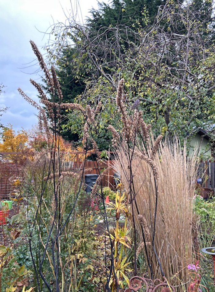 Hierba dorada en el jardín del pradoA finales del verano, las matas se convierten en el rasgo dominante. Originalmente planeé conservar todas las cabezas de semillas hasta febrero, pero descubrí que necesitaba quitar algunas de las semillas excedentes.