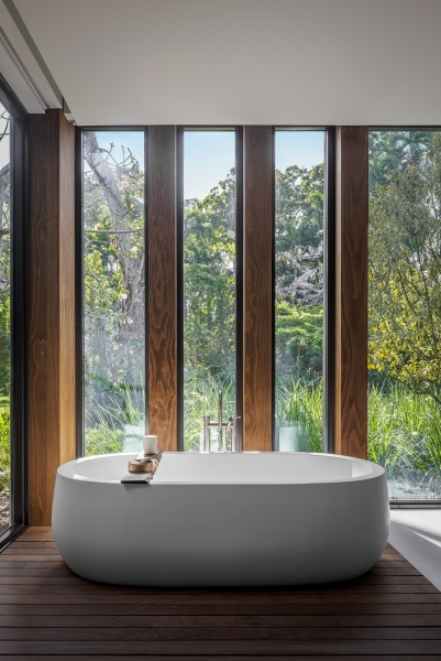 Los materiales naturales suavizan la arquitectura y favorecen un flujo fluido entre el interior y el exterior. La casa está ubicada en un entorno exuberante con un equilibrio relajado entre estructura y paisajismo.