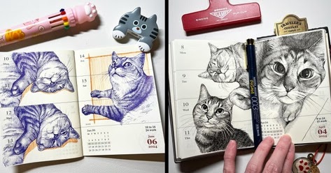 Ineko parece estar dibujando y garabateando. gato Siempre que surge un momento libre. El artista los representa usando una variedad de colores, poses, números de gatos y diferentes tipos de papel. El último elemento al que me refiero es el uso que hace Ineko de calendarios, agendas, cuadernos de bocetos, diarios y papel.