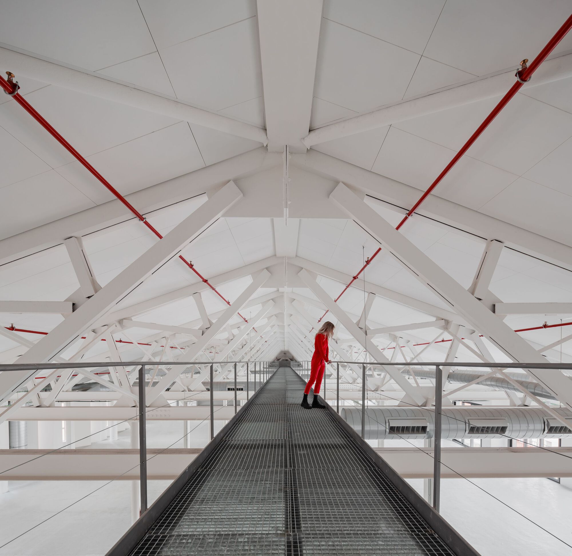 En estos nuevos espacios, las estrategias y materiales utilizados refuerzan el carácter de los espacios industriales que anteriormente los albergaban, al tiempo que intentan incrementar la relación con el mundo exterior. Las láminas y espejos de los baños y los tablones de abeto tricapa de la zona de café se conectan mediante un piso continuo de linóleo natural, contrastando con la resistencia y dureza de las estructuras de concreto y metal que los albergan.