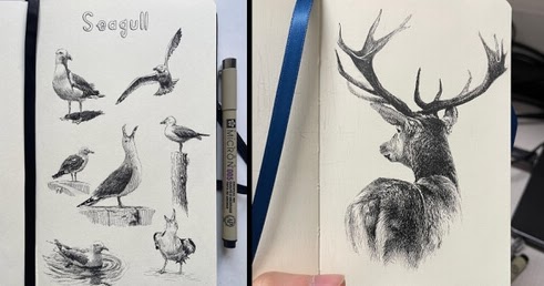 Dibujos a tinta de animales que viven en cuadernos de bocetos.