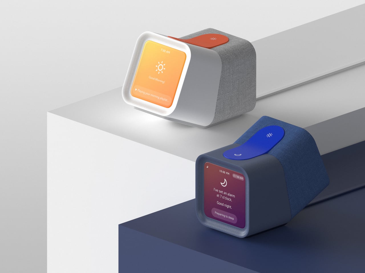 El concepto es un reloj despertador inteligente que también funciona como un conmutador de escenas de IoT. Es un objeto pequeño, en forma de cuña, con una pantalla cuadrada en un lado, mientras que la tela envuelve el resto del cuerpo. En lugar de hacer clic en patrones, inclinas el reloj como un balancín, cambiando entre el día y la noche. La pantalla muestra entonces un sol brillante o una luna tenue, dependiendo de la dirección en la que se encuentre parado.