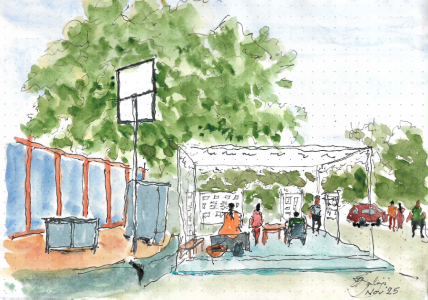 Este es el cuarto boceto que hice en el Evento de Artista de Fin de Semana # 514 de Chennai celebrado en el Templo Marundeeswarar hace unos diez días. Mi boceto es de tamaño A4 y es un boceto a tinta. La mayoría de mis compañeros de dibujo eligieron dibujar templos y terrenos de templos. Pero después de hacerlo varias veces en el pasado, elegí pintar las actividades y escenas de las calles que rodean el templo.