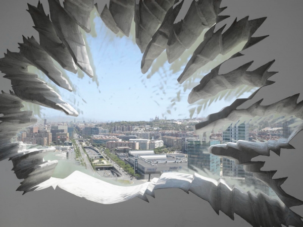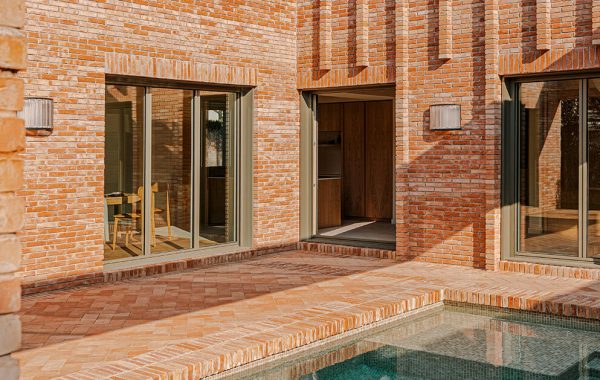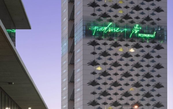 Las ventanas tienen un patrón irregular en forma de hojas, con un patrón de palmeras serigrafiado en el cristal.