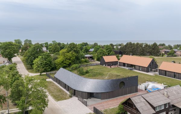 El techo curvo a dos aguas define la silueta única del edificio.