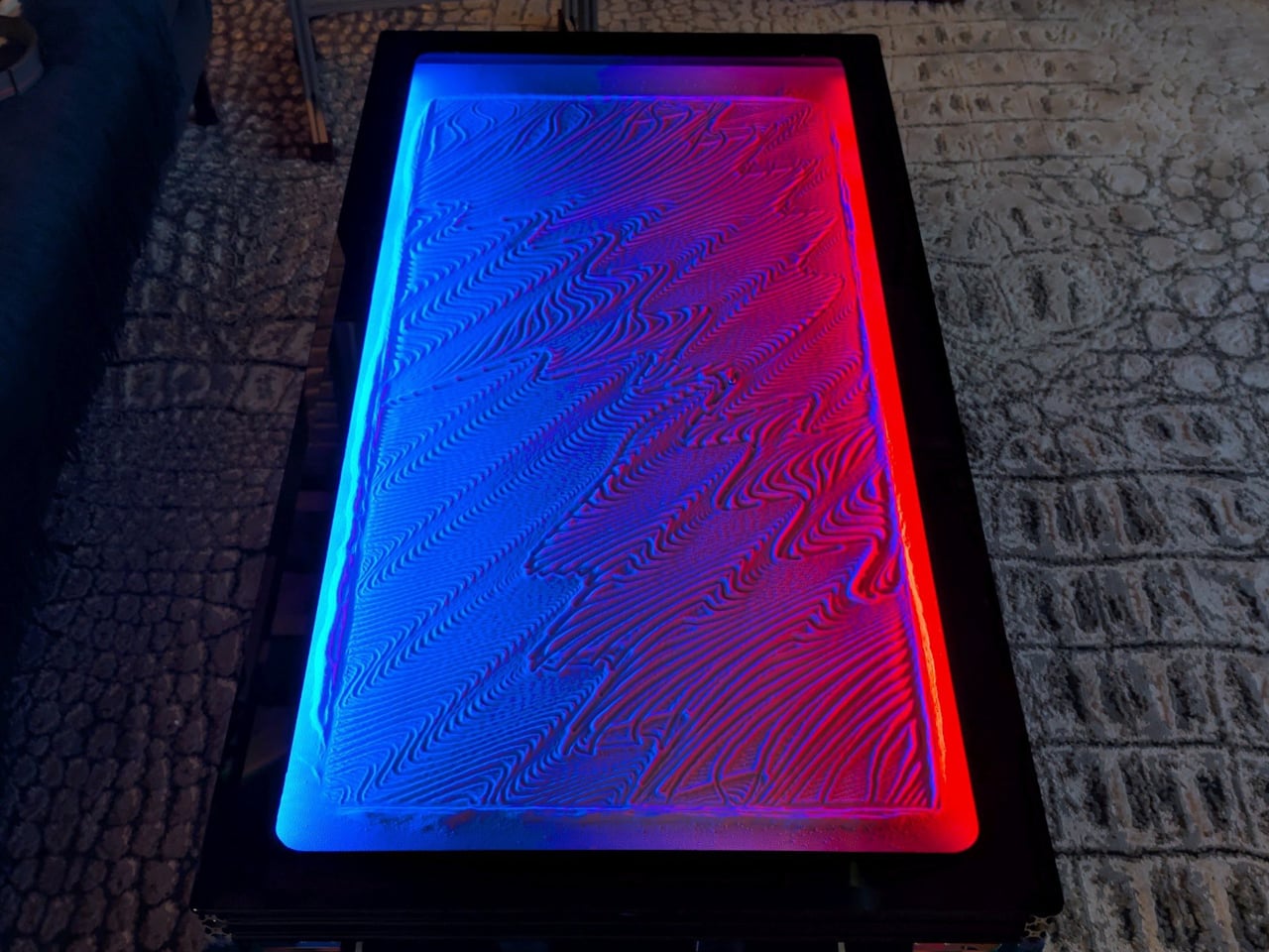 Un marco de aluminio anodizado azul forma la columna vertebral de la mesa y sostiene una caja de arena anodizada negra que se ubica perfectamente en su interior. La arena se asienta sobre una base blanca, por lo que el patrón es claramente visible a través del cristal. Una tapa de vidrio biselado con un marco negro flota arriba, ocultando los LED de la vista directa y haciendo que toda la instalación parezca un mueble terminado en lugar de una pieza de equipo de laboratorio que aún se está modificando.