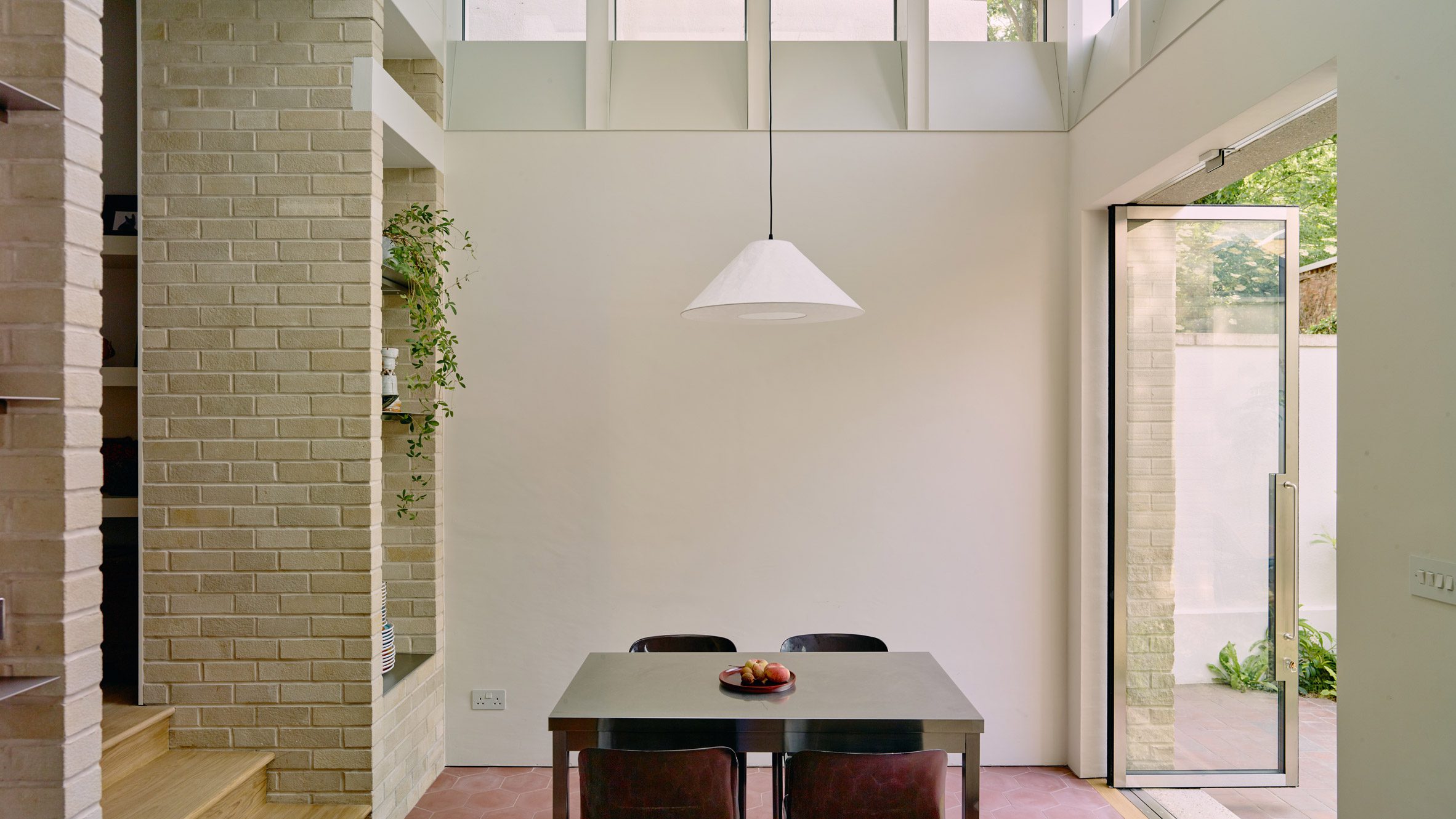 Los ladrillos facetados rugosos forman la base de la ampliación de la cocina, mientras que los ladrillos arenados proporcionan una superficie lisa para las paredes superiores y las particiones internas.