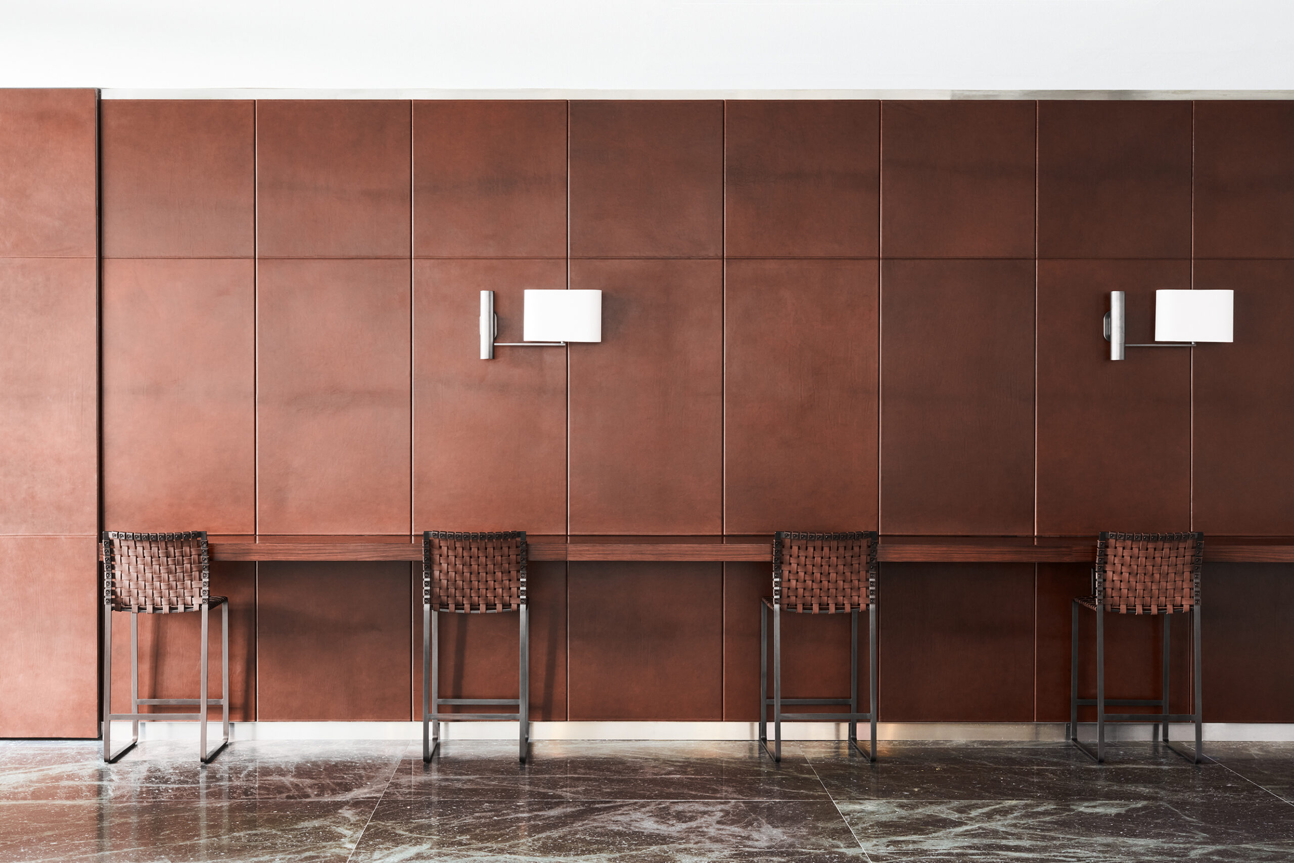 Para los clientes que desconfían de la superficie, recomienda una intensidad específica. «Si un diseñador no puede utilizar demasiado uno de nuestros materiales, siempre decimos: haga puntos de contacto», dijo. Pasamanos, asideros, bancos, bordes de mesas: lugares donde el cuerpo entra en contacto con el edificio. Una estrecha correa de cuero puede realinear una habitación entera.