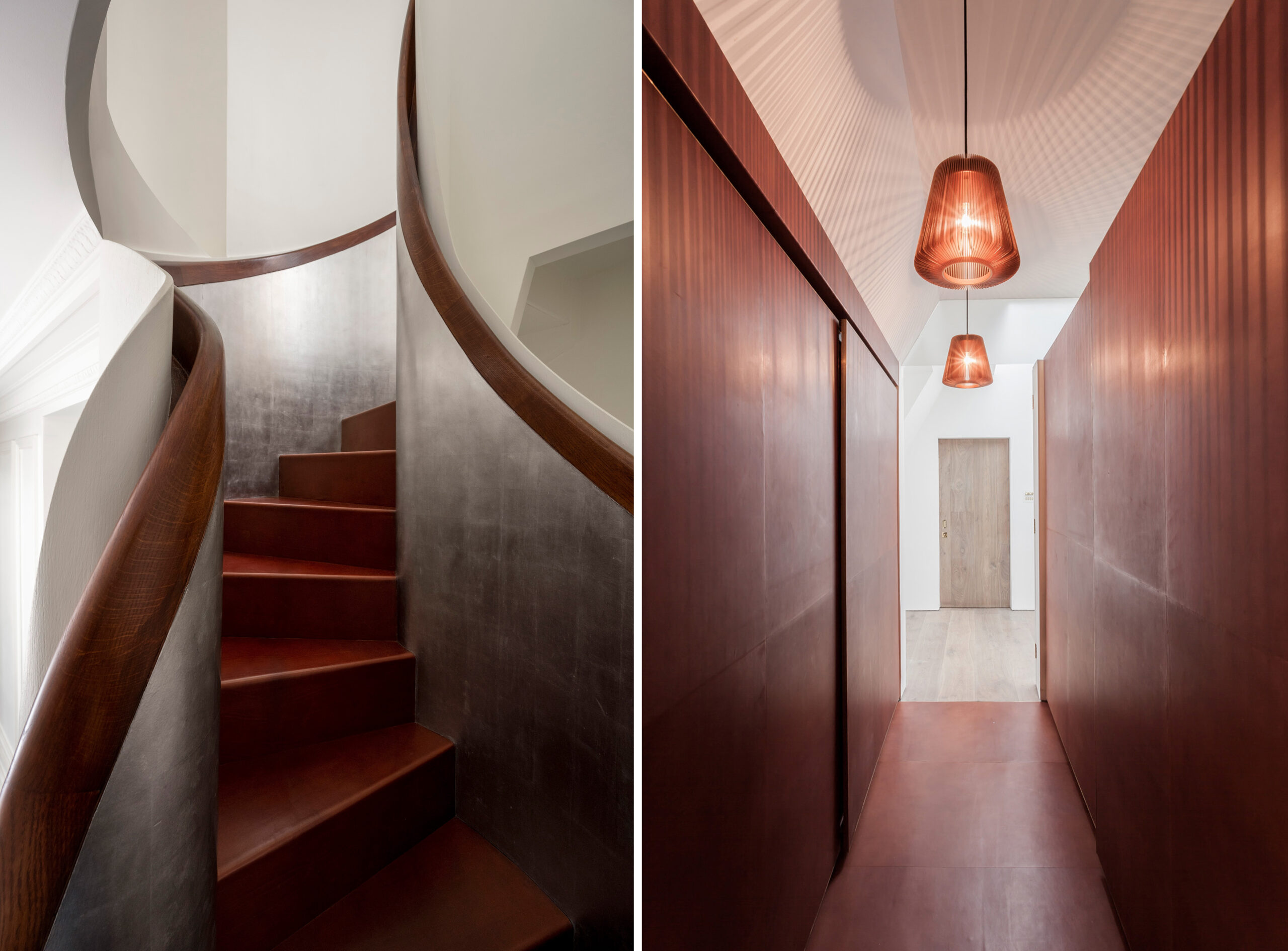 izquierda: escaleras de cuero Estudio Bill Amberg El apartamento de Dora Hart en París | Reproducción artística de Dora Hart Fotografía de Vincent Leroux | Correcto: Paredes de cuero y puertas corredizas en Orset Terrace, Londres, Reino Unido, diseñadas por Bill Amberg Studio