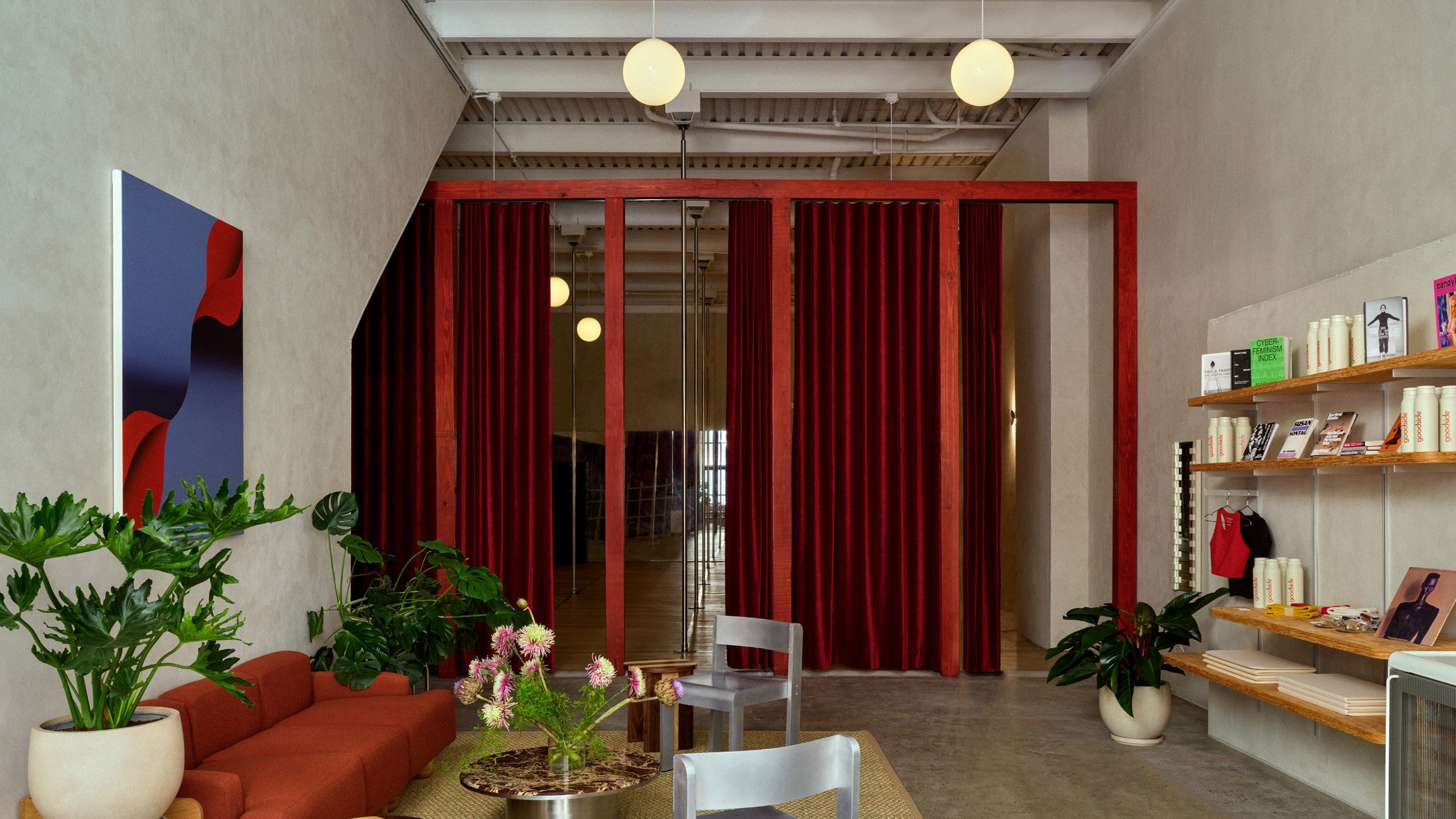 Una gran partición roja, completa con cortinas carmesí, sostiene el espacio y conduce al estudio de barras más allá. La Oficina del Espacio Tangible dijo que el «portal» era uno de los elementos más importantes del diseño.