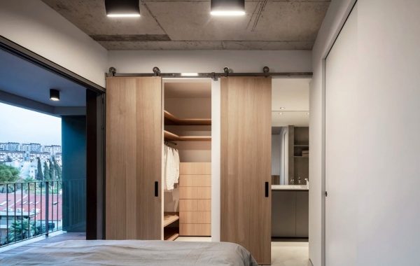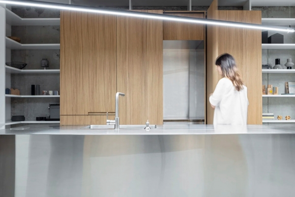 El mueble detrás de la cocina es modular y se puede abrir o cerrar completamente para ocultar la zona de servicio técnico. El suelo y la isla están fabricados en acero inoxidable cepillado para reflejar la luz filtrada.