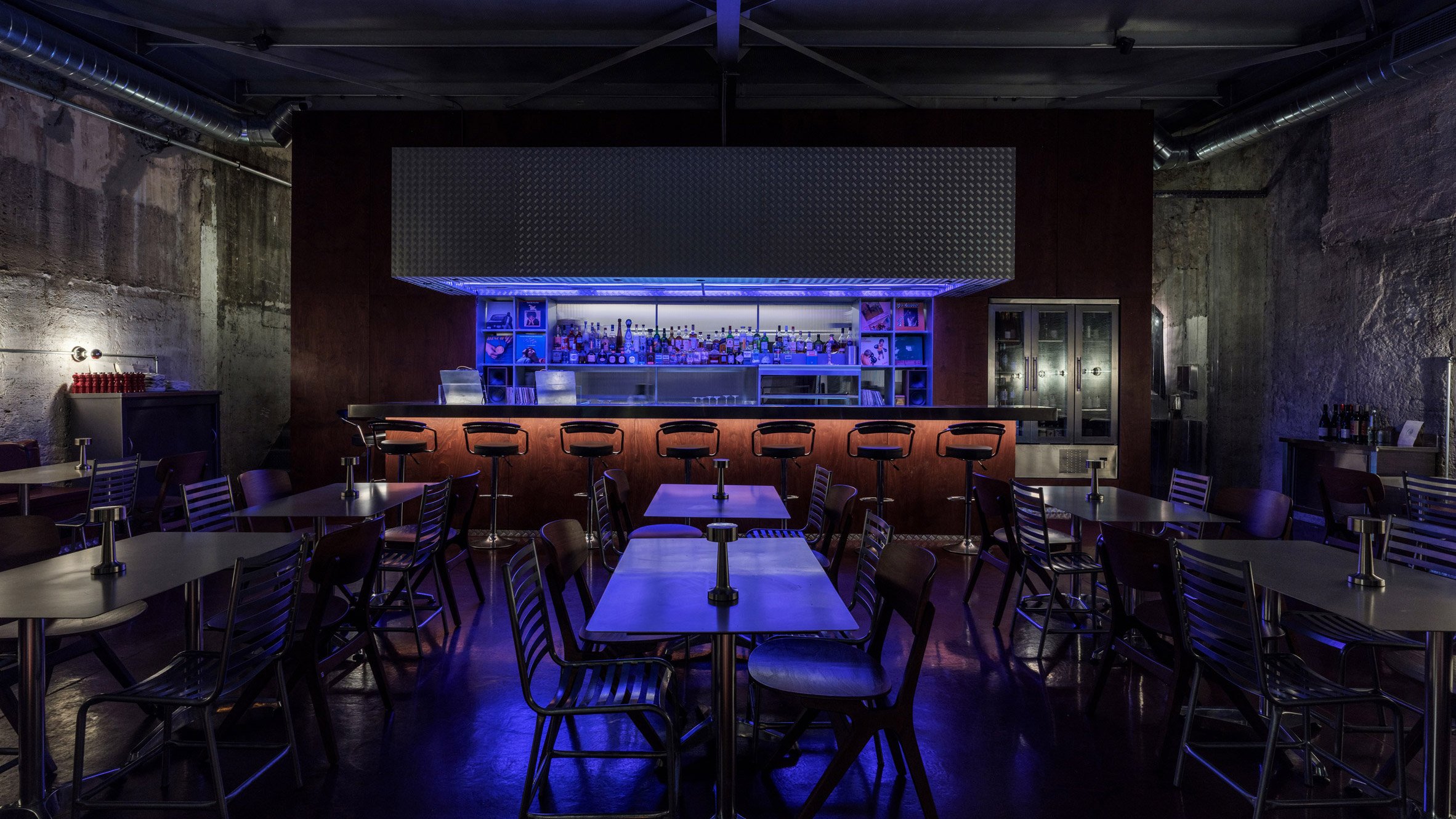 Los diseñadores crearon un concepto de “caja dentro de una caja” para el espacio, en el que el interior contiene la cocina, el almacenamiento y los baños, mientras que el bar y el restaurante forman un anillo exterior a su alrededor.