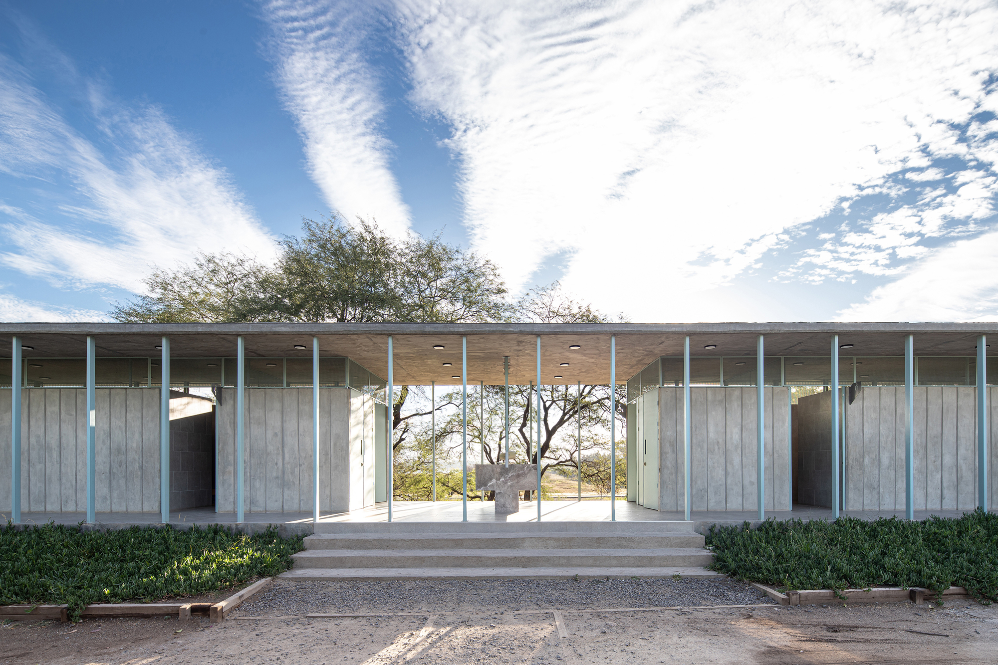 El baño está configurado como caja de hormigón incrustada en la vegetación – Las acacias, los cuernos de ciervo y los arbustos procedentes de la zona crean un diálogo directo con el paisaje circundante. Los dos bloques están separados por un vestíbulo central que integra lavabos y espejos, facilitando el control visual y social del espacio. Entre paredes y cubierta, franjas perforadas permiten la ventilación cruzada y la entrada de luz natural, potenciando la sensación de apertura y seguridad.
