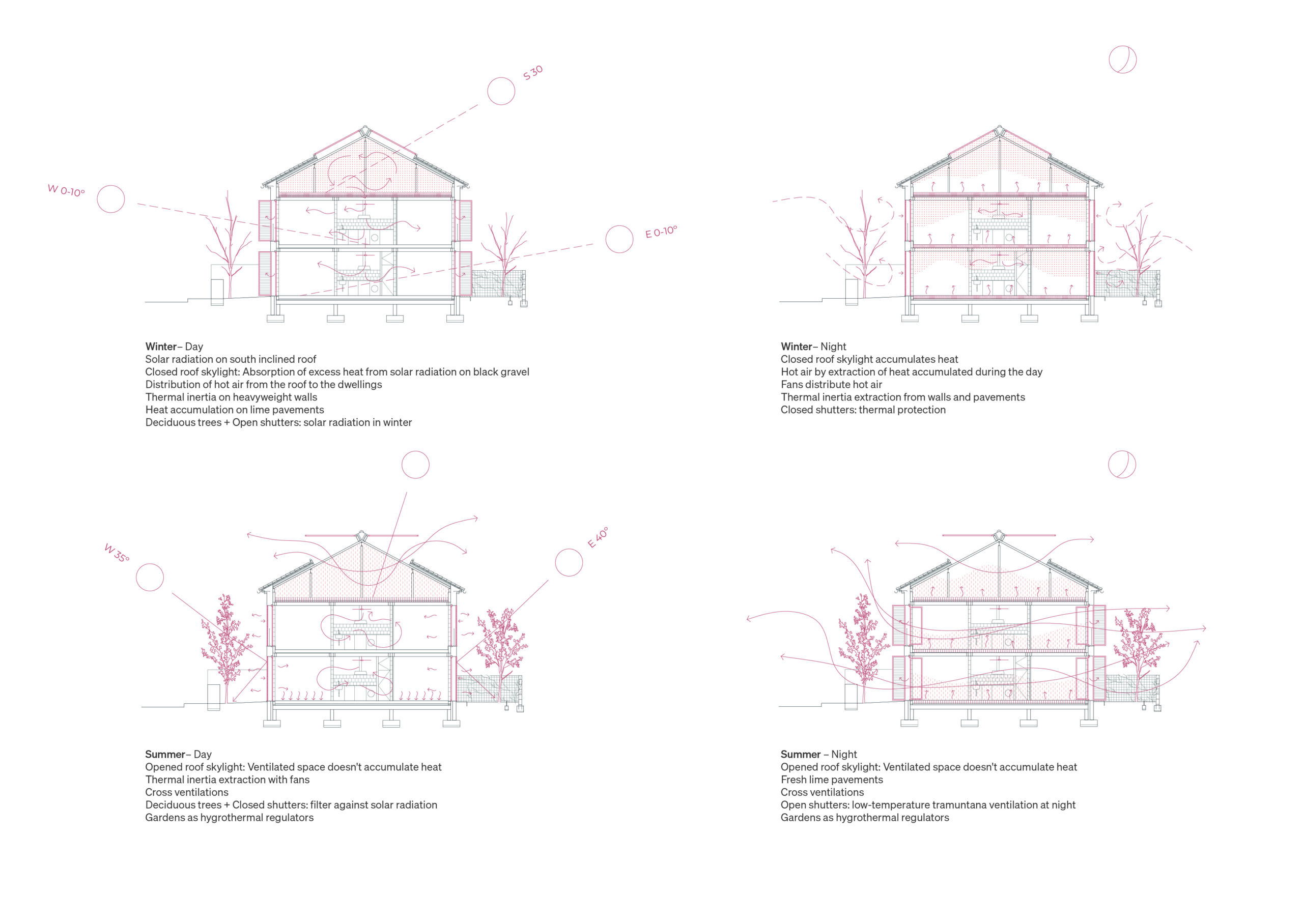 Combinado con protección solar, suelos y paredes de alta inercia térmica y humedad que regula la absorción de humedad, el consumo de electricidad es muy bajo: 1,7 kWh/m2 por año. La clave para regular las temperaturas, limitando así la necesidad de sistemas activos que consuman mucha energía, es agregar inteligentemente techo trompetaayudando a retener el calor en el invierno y al mismo tiempo proporcionando ventilación vital durante los calurosos meses de verano.