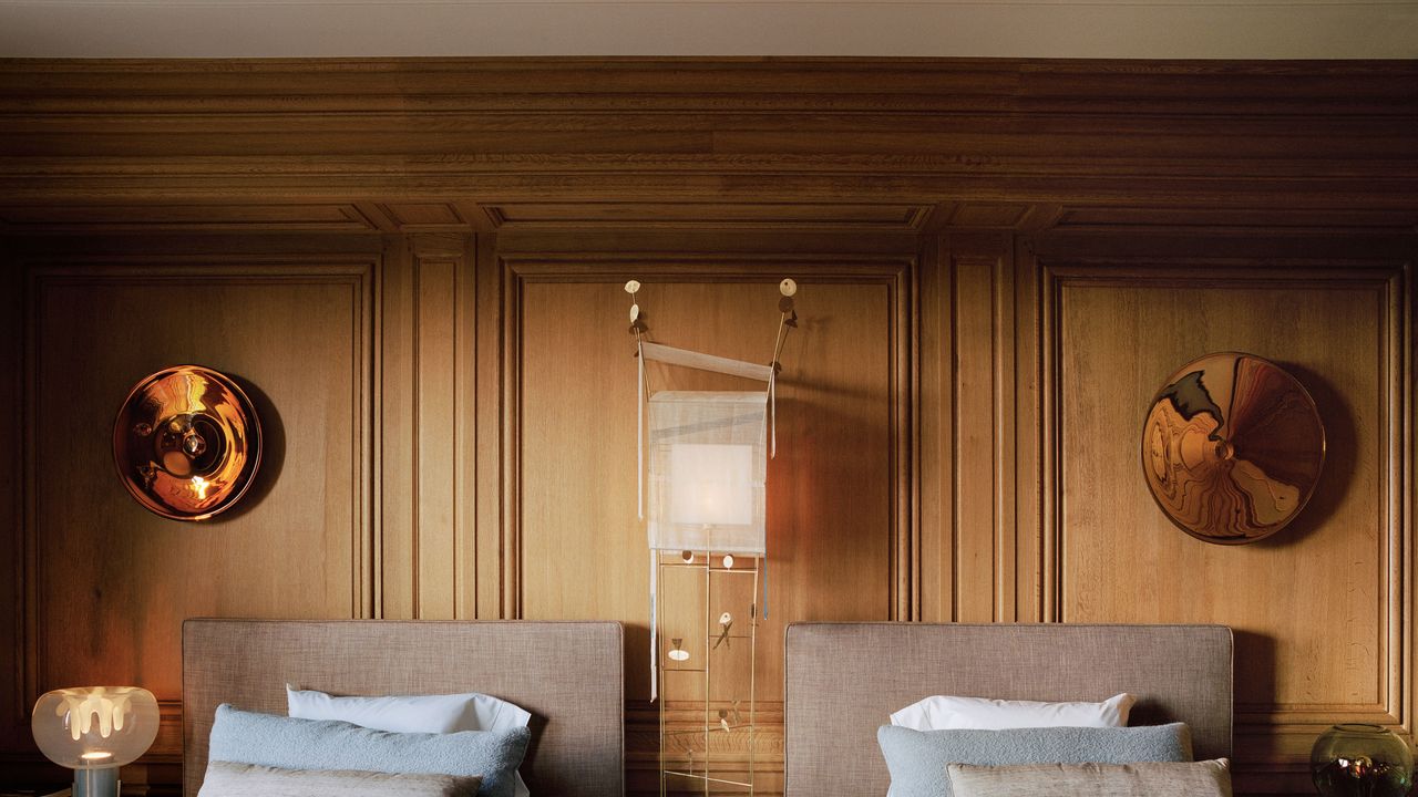 Por supuesto, esta mejora quirúrgica requiere una precisión especializada. “Construir la arquitectura adecuada es muy importante”, dijo Michael. “Pasamos mucho tiempo dibujando”. Sólo después de dominar el complejo diseño, los diseñadores recurrieron a mejoras interiores. Especificaron nuevos pisos de parquet Versailles Oak en todo el espacio para unificarlo y trabajaron con la reconocida firma francesa Féau Boiseries para diseñar tratamientos de pared personalizados. Estos van desde paneles de yeso de hojas plateadas en la encantadora entrada hasta paneles color crema con guirnaldas y cartelas en la sala y el comedor (“más tradicionales de lo que usamos habitualmente”, admite Michael), un reluciente espejo de cristal de mercurio en el pasillo y paneles de roble pálido en el dormitorio del hijo que recuerda a una biblioteca de la Ivy League.