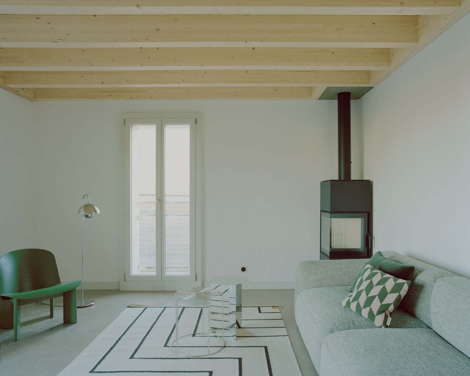La base de la casa está construida en hormigón, asegurando una base sólida anclada al terreno, mientras que los pisos superiores están construidos en madera, aportando ligereza y calidez a los espacios habitables. Los arquitectos eligieron un hormigón más ecológico con un mayor contenido de arcilla, lo que reduce la huella de carbono y al mismo tiempo le da un tono beige cálido que combina naturalmente con otros materiales utilizados en el proyecto. Para mantener la materialidad natural, el yeso de cal y el mortero de anhidrita sustituyeron al cemento, favoreciendo una mejor regulación de la temperatura y la humedad.