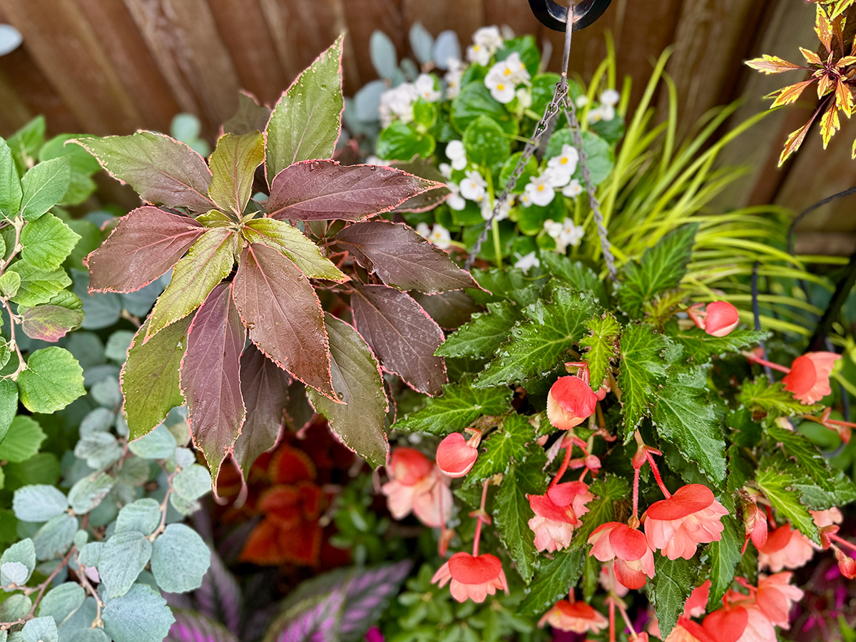 Primer plano de la plantación en contenedores con follaje colorido y flores de duraznoArianne tiene un ojo increíble para las combinaciones de plantas, especialmente cuando mezcla flores con follaje, lo que ya se nota. Como si eso no fuera lo suficientemente impresionante, ¡cultiva con éxito la mayoría de sus plantas anuales a partir de semillas!