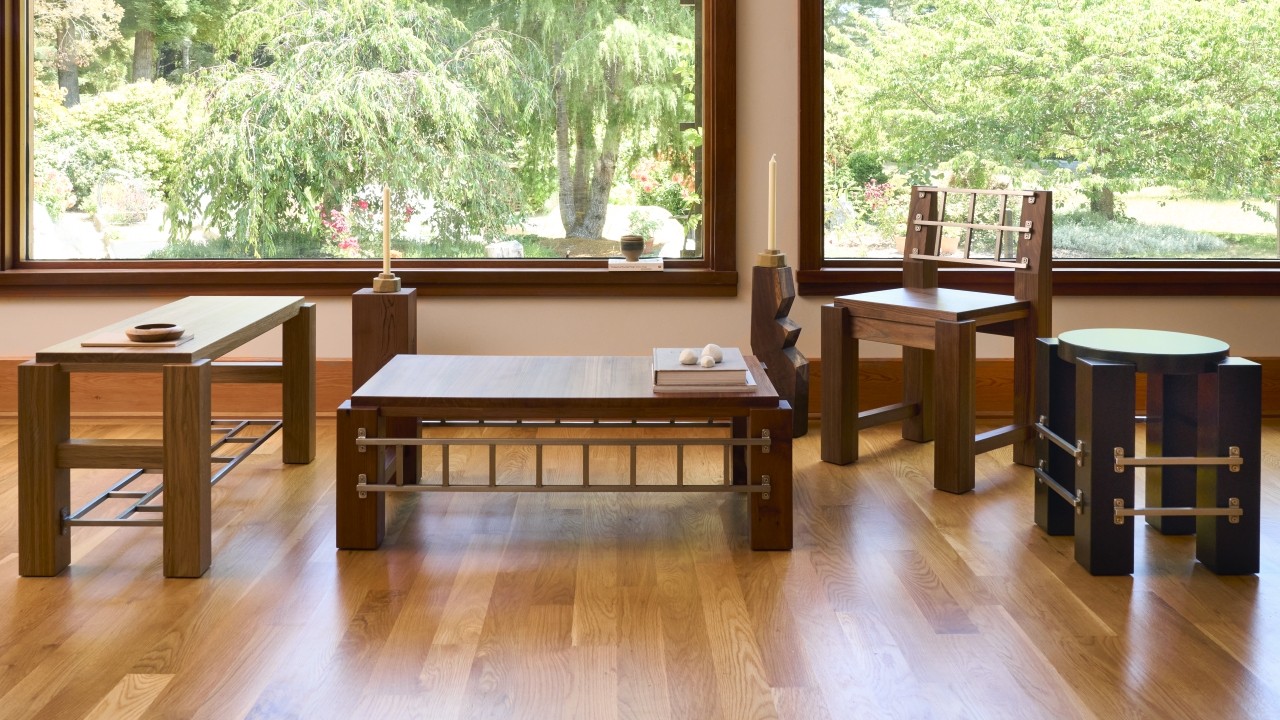 La mesa de centro Barred está hecha de secoya recuperada que sirvió como poste esquinero en la casa en su vida anterior, con barras de acero en forma de escalera que unen los lados para darle una apariencia gruesa y sólida. Finalmente, el banco con barandilla presenta una malla debajo de su asiento, lo que agrega resistencia estructural y una segunda superficie de almacenamiento.