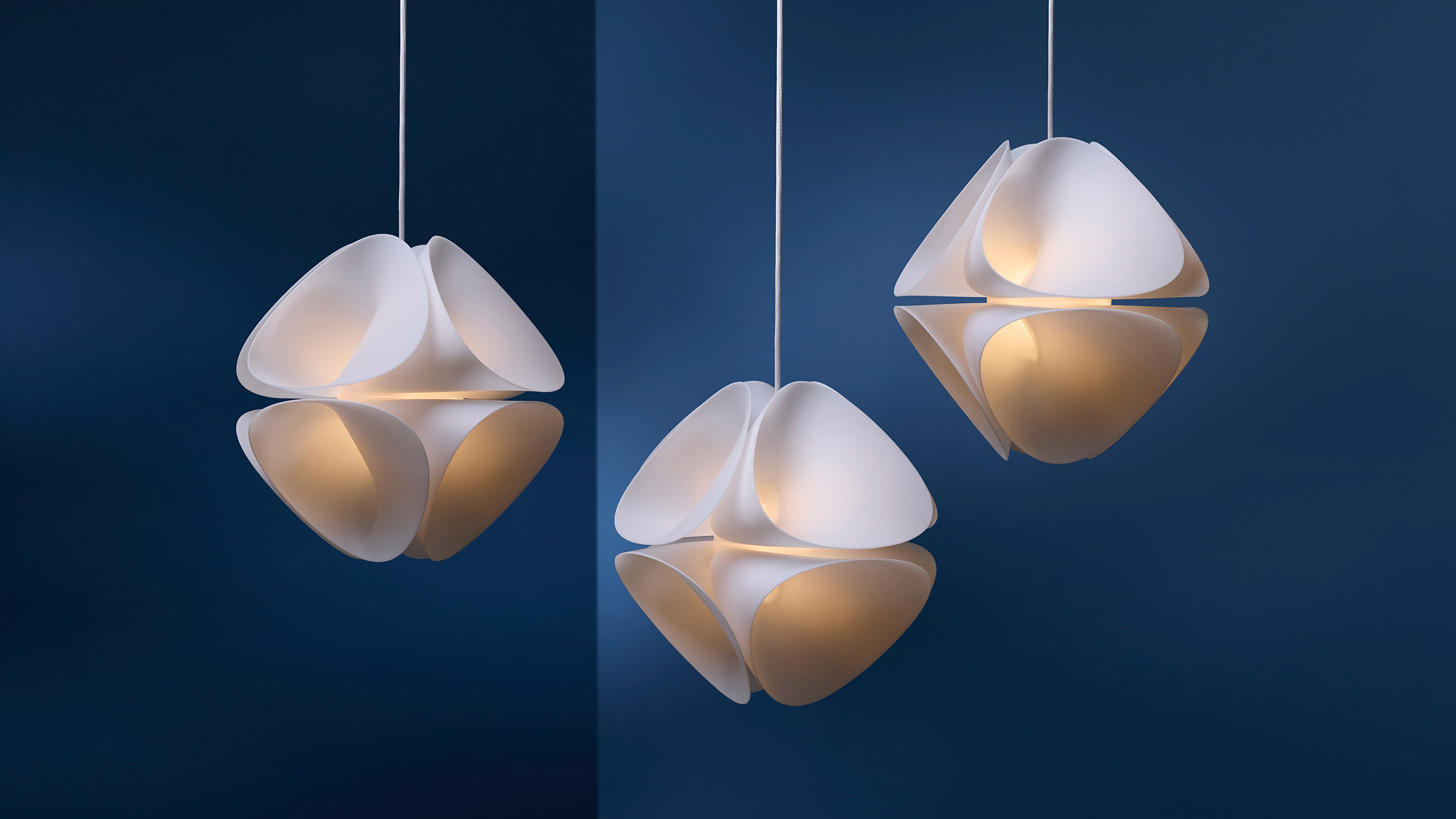 este lámpara nueva Compuesto por ocho conos en espiral, su forma se deriva del principio de la proporción áurea, un patrón observado en la naturaleza en conchas, flores e incluso galaxias.
