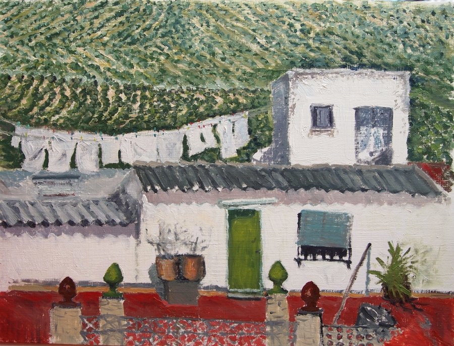 Publicando de nuevo un antiguo cuadro de exterior pintado en la provincia de Sevilla. Me paré en la azotea y pinté la vista de las cabañas y los campos de olivos. Al principio la ropa todavía estaba tendida, pero durante el proceso de pintura alguien vino a recogerla. Ojalá no hubiera publicado esto antes al aire libre.