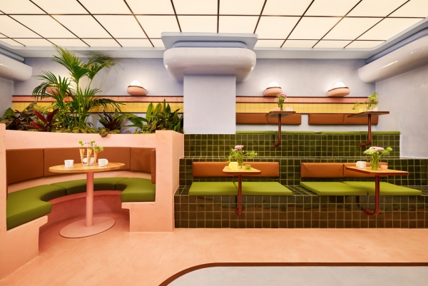 Amiko Gelato está situado en el distrito del Eixample de Barcelona. El interior de 1,500 pies cuadrados combina curvas Art Deco y tonos suaves con detalles envolventes para crear un ambiente comercial vibrante para cada visitante.