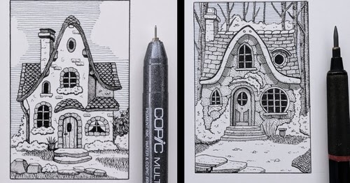 encantador diminuto y caprichoso Edificios en dibujos arquitectónicos en tinta.