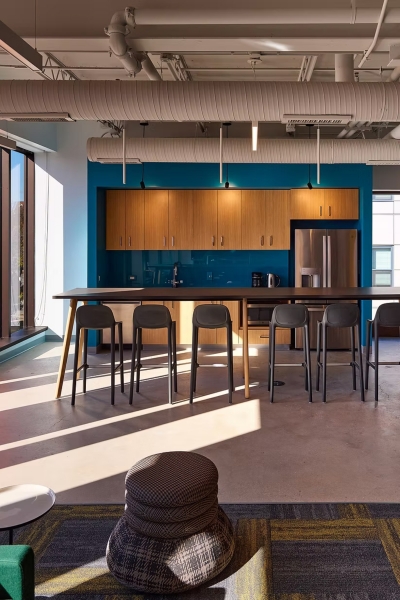 Una pequeña cocina/comedor está directamente adyacente a la gran sala de eventos/capacitación, lo que permite un uso flexible del espacio para reuniones previas y posteriores al evento.