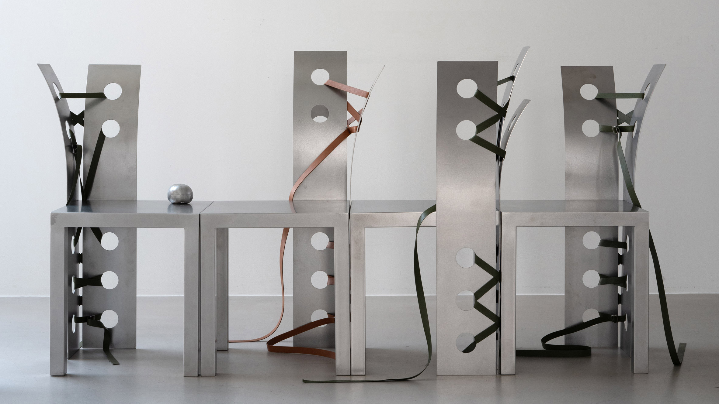 Las piezas escultóricas presentan formas geométricas limpias, con los respaldos de las sillas curvados hacia atrás y que parecen estar unidos por bridas de cuero.