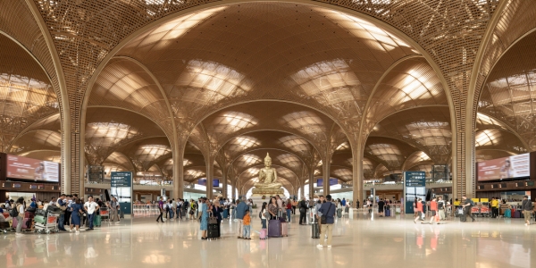 El diseño de la terminal presenta una cabina central flanqueada por dos muelles en forma de ala, lo que minimiza las distancias a pie y optimiza la circulación.