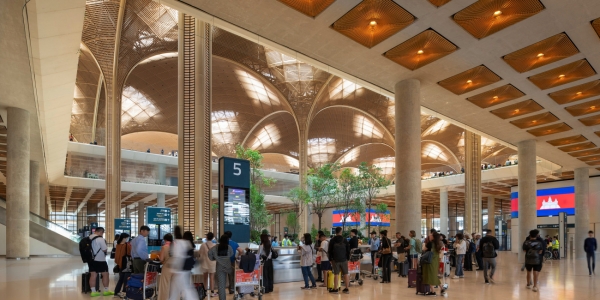 El interior incorpora paisajes tropicales. Árboles nativos, palmeras y plantas locales crecen dentro del espacio central, creando una fuerte conexión entre el edificio y el paisaje.