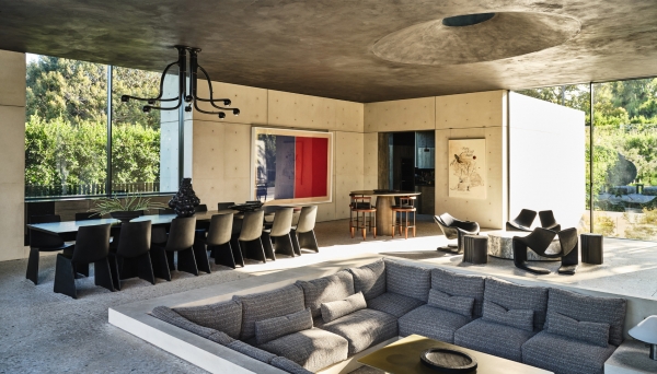 Una zona de estar hundida se encuentra dentro del pabellón de la casa de la piscina del proyecto como parte de un espacio de entretenimiento separado, completo con una gran mesa de comedor y una cocina totalmente equipada.