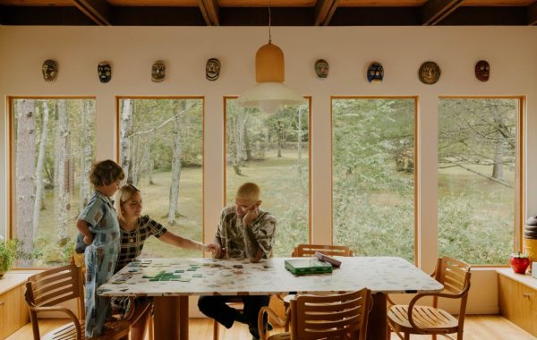El interior de la casa está revestido con paneles de madera y las ventanas de altura completa ofrecen vistas del paisaje.