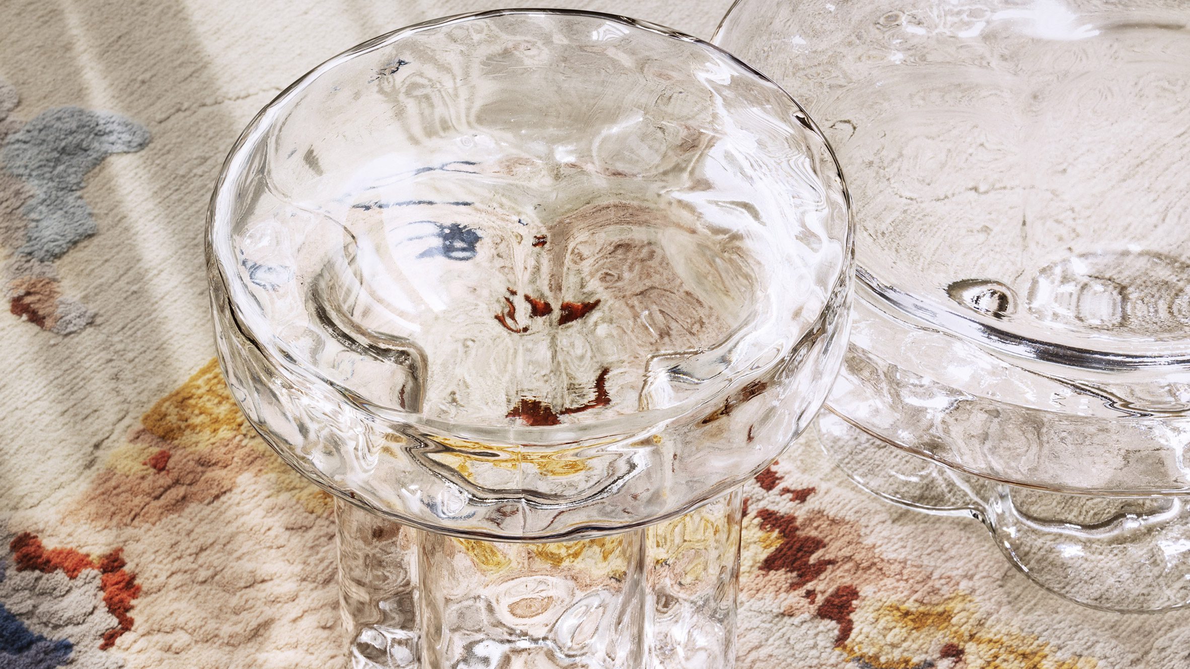 Sala de exposición Dezeen: uno mesa Fabricado íntegramente en transparente, incoloro. cristal de murano Formar una textura moteada es uno de los siete nuevos productos que se exhiben en la sala de exposición de Dezeen.