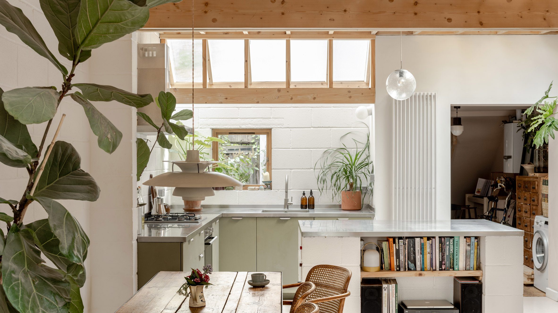 la ampliación combina paredes de bloques pintados con una estructura de techo de madera expuesta