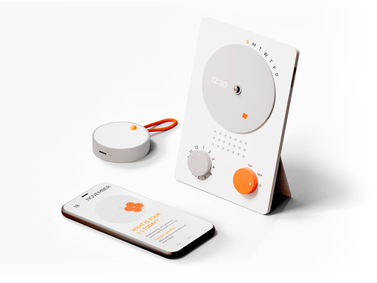 El lenguaje visual de Clover, las superficies blancas y grises con detalles en naranja, la tipografía suave y los íconos de Clover que aparecen en el hardware y la interfaz de usuario, hacen que el sistema se sienta menos como un dispositivo médico. Los valores fundamentales, la honestidad hacia uno mismo, el equilibrio emocional y la positividad diaria están integrados en su apariencia y comportamiento. Se posiciona como una aplicación y un objeto de escritorio amigable que no te importa ver todos los días, en lugar de un recordatorio de que algo está roto.